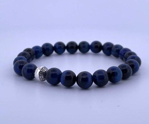 Mannenarmband met blauwe tijgeroog 8mm met sterling zilveren kraal.